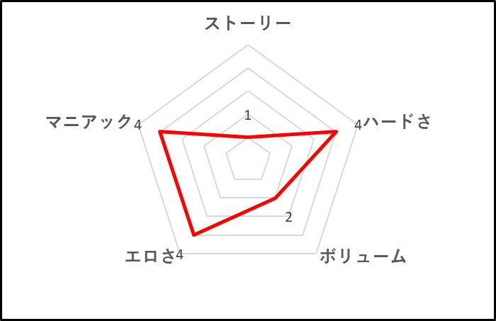 ストーリーは論外。ハードさはよかったものの、やはり使いまわしシーンが多く、キャラによってバランスの偏りがかなりあるため、クライミライシリーズの中でもボリュームは悪い方となっています。