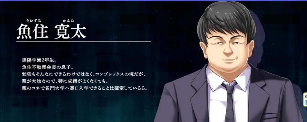 本作の汚男枠は、竿役の一人でヒロインたちと同じ学校に通う魚住寛太。序盤からヒロインたちを肉奴隷にするため金を使い不良たちをけしかけるも返り討ちに遭い、その後父の仕事仲間がレイプしているのを見て輪姦に加わっていきます。