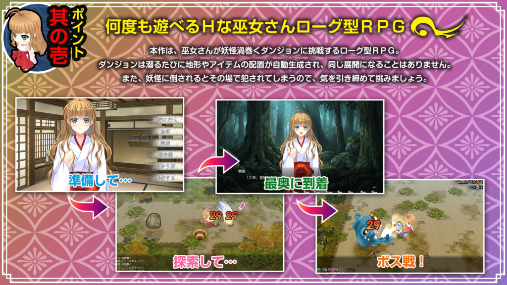 神楽新風記シリーズは特定のヒロインのみに絞り、ボリュームを抑えることで低価格で販売している、現在のでぼの巣のメインコンテンツ。エロシーン、ローグライク要素を売りにしている分ストーリーが薄く、序盤で「後輩が倒した妖妖怪が復活し、それを再び倒す」というそれっぽい伏線がはられますが、言うほどオチもない。