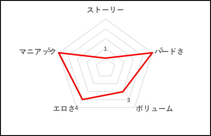 ストーリーは触れた通り、ハードさはもちろんトップの。ボリュームについては現在は1000円台で買えることも多いものの、シチュエーションが特化したものが多く、はっきり刺さる人と刺さらない人の差が大きいため、万人向けでなく使えそうなシチュも限られるので、全体のコスパは悪めです。