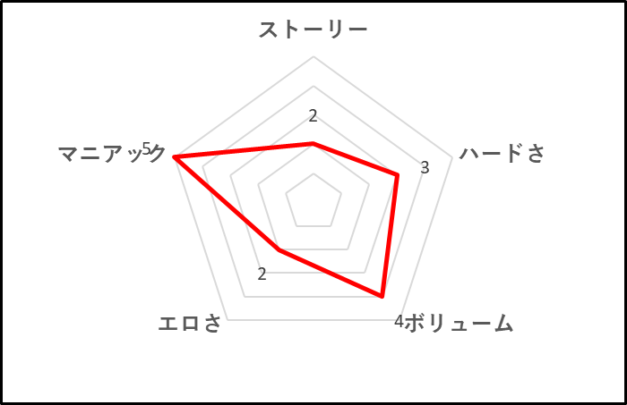 最後まで改造されたことを認識できないという点では他にはないジャンルのためマニアック度は高めですが、シチュエーション上ヒロインの属性にビジュアル以上に意味合いがないため、エロは低めになっています。